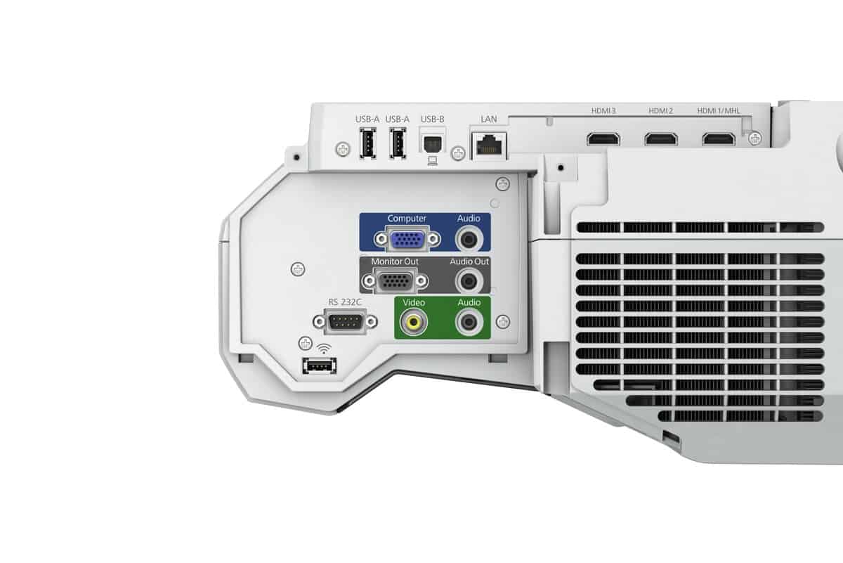 Υπερευρυγώνιος (short throw) projector της Epson με πηγή φωτός Laser . Ικανός να προβάλει εικόνα σε πανί ανοίγματος 2 μέτρων απο την εκπληκτικά μικρή απόσταση των 47 εκατοστών, μπορεί επομένως να τοποθετηθεί πολύ κοντά στο πανί χωρίς απώλειες στη φωτεινότητα και αφήνοντας το χώρο πίσω του ελεύθερο αποφεύγοντας τις “σκιές” από τη μετακίνηση του προσωπικού.
