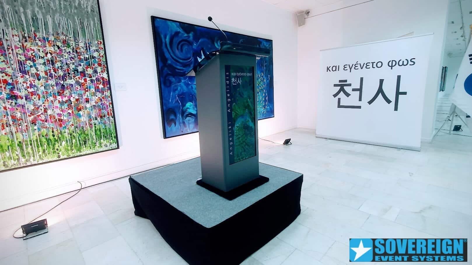 Ένα μοναδικό αναλόγιο ομιλητών σε μοντέρνα και απλή γεωμετρική γραμμή και με το αλουμίνιο και το plexi glass να κυριαρχούν στη δομή του. Στη πρόσοψή του δεσπόζει μια ultra wide οθόνη 34 ιντσών για τη ψηφιακή απεικόνιση λογοτύπων, ονομάτων…